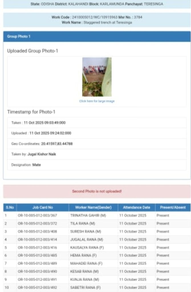 କେସିଙ୍ଗା -୧୩/୧୦ କଳାହାଣ୍ଡି ଜିଲ୍ଲା କର୍ଲାମୁଣ୍ଡା ବ୍ଲକ ଅନ୍ତର୍ଗତ କର୍ଲାମୁଣ୍ଡା ପଞ୍ଚାୟତର ତେରେସିଙ୍ଗା ଠାରେ ଏହି ମାସ ୧୧ ତାରିଖରେ ମନରେଗା ଯୋଜନାରେ ଏକ ଇତସ୍ତତଃ ନାଳ କାମରେ ଜାଲିଆତି କରି ବ୍ୟାପକ ଅର୍ଥ ଆତ୍ମସାତ ହୋଇଥିବା ଅଭିଯୋଗ ହୋଇଛି। ଅଭିଯୋଗରୁ ପ୍ରକାଶ ଯେ ଉକ୍ତ କାମର କୋର୍ଡ ନମ୍ବର ୨୪୧୦୦୦୫୦୧୨/ଡବ୍ଲୁସି/୧୦୯୧୫୯୬୩ ଥଲାବେଳେ ମଷ୍ଟରରୋଲ ନଂ ୩୭୮୦ ରହିଛି। କାମର କୋଅର୍ଡିନେଟରଙ୍କ ନମ୍ବର ୨୦୪୧୫୯୮୫, ୮୩୪୪୭୮୯୧୭ ଥିଲାବେଳେ ଗ୍ରାମସାଥୀ ଯୁଗଳ କିଶୋର ନାଏକ ଏଥିରେ ନିୟୋଜିତ ୬ଟି ଦଳର ୬୦ ଜଣଙ୍କ ଜିଓ ଟେକ୍ ଫଟୋ ନେଇ ମଷ୍ଟରରୋଲ ତିଆରି କରାଯାଇଥିବା କୁହାଯାଉଛି। କିନ୍ତୁ ଏମାନଙ୍କ ନାମରେ ଭିନ୍ନ ଭିନ୍ନ ଜବ୍ କାର୍ଡ ଥିବାବେଳେ ଗୋଟିଏ ଦଳର ୧୦ ଜଣ ଶ୍ରମିକଙ୍କ ଯେଉଁ ଫଟୋ ନିଆଯାଇଛି ସେହି ଗୋଟିଏ ଫଟୋ ୬ଟି ଗ୍ରୁପରେ ଯୋଡା ଯାଇଥିବା ଦେଖିବାକୁ ମଳିଛି। ଓଡିଶା ସରକାର ୨୦୨୫-୨୬ ଆର୍ଥିକ ବର୍ଷ ନିମନ୍ତେ ଅଣକୁଶଳୀ ମନରେଗା ଶ୍ରମିକଙ୍କ ଦୈନିକ ମଜୁରୀ ୩୭୦ ଟଙ୍କା କରିଥିବା ବେଳେ କେନ୍ଦ୍ର ସରକାର ଦୈନିକ ୭୮୩ ଟଙ୍କା କରିଛନ୍ତି। ଓଡିଶା ସରକାରଙ୍କ ଧାର୍ଯ୍ୟ ଦୈନିକ ମଜୁରୀ ୩୭୦ ଟଙ୍କା ହିସାବରେ ୬୦ ଜଣଙ୍କ ୨୨ ହଜାର ୨୦୦ ଟଙ୍କା ହେରଫେର କରି ଗୋଟିଏ ଦିନରେ ଆତ୍ମସାତ କରାଯାଇଛି ବୋଲି ସାଧାରଣରେ ଚର୍ଚ୍ଚାର ବିଷୟ ହୋଇଛି। ତେଣୁ ଏହି ଦୁର୍ନୀତିର ଉଚ୍ଚସ୍ତରୀୟ ତଦନ୍ତ କରି ଦୋଷୀ ବିରୁଦ୍ଧରେ ଦୣଢ କାର୍ଯ୍ୟାନୁଷ୍ଠାନ ଗ୍ରହଣ କରିବା ପାଇଁ ବିଭିନ୍ନ ମହଲରେ ଦାବି ହେଉଛି।