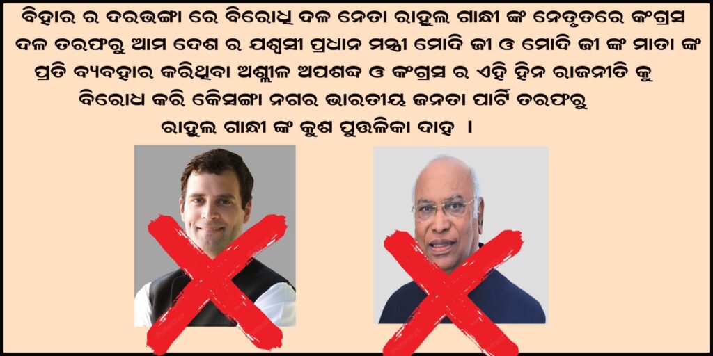 କେସିଙ୍ଗା-31/8 ବିହାରର ଦରଭଙ୍ଘା ଠାରେ ନିର୍ବାଚନ ପ୍ରଚାର ସମୟରେ ବିରୋଧୀଦଳ ନେତା ରାହୁଲ ଗାନ୍ଧୀ ଓ ଜାତୀୟ କଂଗ୍ରେସ ଦଳର ସଭାପତି ଶ୍ରୀ ଖଡଗେ ଭାରତର ପ୍ରଧାନମନ୍ତ୍ରୀ ଶ୍ରୀ ମୋଦୀ ଓ ତାଙ୍କ ସ୍ବର୍ଗୀୟ ମାତାଙ୍କ ବିରୋଧରେ ଦେଇଥିବା ଅପମନ୍ତବ୍ୟ ବିରୁଦ୍ଧରେ ଆଜି କେସିଙ୍ଗା ନଗର ବିଜେପି ପକ୍ଷରୁ ଏହାର ପ୍ରତିବାଦରେ ଦୁଇ କଂଗ୍ରେସ ନେତାଙ୍କ କୁଶ ପୁତଳିକା ଦାହ କରିଥିଲେ। ଏହି ପ୍ରତିବାଦ ସଭାରେ କଂଗ୍ରେସ ବିରୁଦ୍ଧରେ ବିଭିନ୍ନ ନାରା ଦେଇ ଏଭଳି ହୀନ ରାଜନୀତିରୁ ଦୂରେଇ ରହିବାକୁ ଚେତାବନୀ ଦେଇଥିଲେ। ଏହି ସଭାରେ କଳାହାଣ୍ଡି ସାଂସଦ ମାଳବିକା ଦେବୀ, ଜିଲ୍ଲା ବିଜେପି ସଭାପତି ଯୁଗଳ ପୋଢ, କେସିଙ୍ଗା ବ୍ଲକ ସଭାପତି ଚନ୍ଦନ ସେନାପତି, କେସିଙ୍ଗା ନଗର ସଭାପତି ପିଙ୍କୁ ପରିଡା, ଜିଲ୍ଲା ବିଜେପି ସମ୍ପାଦକ ସନ୍ତୋଷ ଦାଶଙ୍କ ସମେତ ବହୁ ବିଜେପି କର୍ମୀ ଉପସ୍ଥିତ ଥିଲେ।